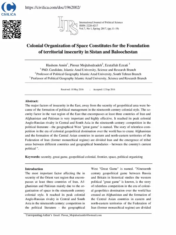 Colonial organization of space constitutes for the foundation of territorial insecurity in Sistan and Baloochestan