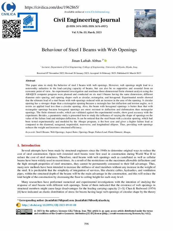 This paper aims to study the behavior of steel I beams with web openings. However, web openings might lead to a noteworthy reduction in the load-carrying capacity of beams, but can also be so supportive and essential from an economic point of view. An experimental investigation and nonlinear three-dimensional finite element analysis using the ABAQUS computer program were planned and conducted on six steel I-beams having the same dimensions, different diameter ratio spacing, and opening shapes such as circular, rectangular, and hexagonal. Experimental results showed that the ultimate load of a steel beam with web openings reduced with an increase in the area of the opening. A circular opening has a stronger shape than a rectangular opening because a rectangle has fast deflection and torsion angles, so it resists an applied load less than a circular opening. Also, the beam with hexagonal openings is better than that with rectangular openings because hexagonal openings are more resistant to deflection and deformation than rectangular openings. The finite element results, which are validated against the experimental results, show good accuracy with the experiment. Besides, a parametric study is presented here to study the influence of varying the shape of openings on the value of the failure load and midspan deflection. It can be noticed that the steel beam with a circular opening, which had been tested experimentally and modeled by the Abaqus program, is the best case and gives a higher failure load as compared to the diamond, octagonal, trapezoidal, transverse, and longitudinal ellipses. Thus, providing web openings reduces the weight and increases structural efficiency. Doi: ۱۰.۲۸۹۹۱/CEJ-۲۰۲۳-۰۹-۰۳-۰۸ Full Text: PDF