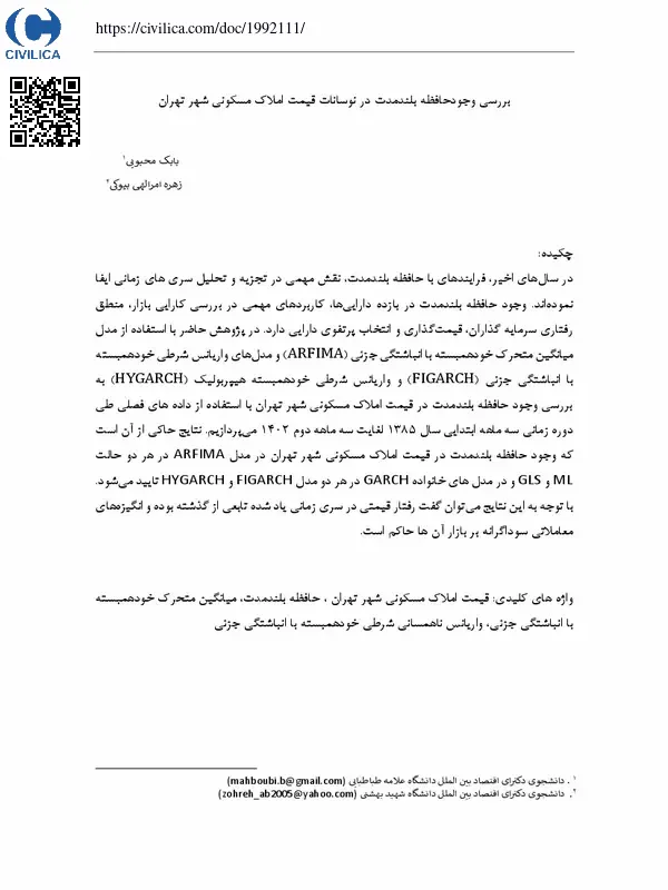 بررسی وجودحافظه بلندمدت در نوسانات قیمت املاک مسکونی شهر تهران
