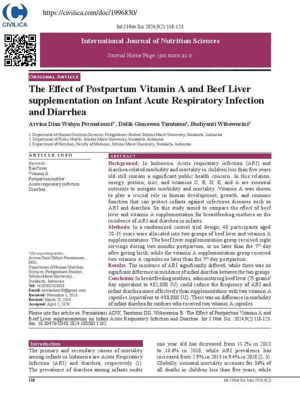 Background: In Indonesia, Acute respiratory infection (ARI) and diarrhea-related morbidity and mortality in children less than five years old still remain a significant public health concern. In this relation, energy, protein, zinc, and vitamins C, B, D, E, and A are essential nutrients to mitigate morbidity and mortality. Vitamin A was shown to play a crucial role in human development, growth, and immune function that can protect infants against infectious diseases such as ARI and diarrhea. So this study aimed to compare the effect of beefliver and vitamin A supplementation for breastfeeding mothers on the incidence of ARI and diarrhea in infants.Methods: In a randomized control trial design, ۴۰ participants aged ۲۰-۳۵ years were allocated into two groups of beef liver and vitamin A supplementations. The beef liver supplementation group received eight servings during two months postpartum, or no later than the ۷th day after giving birth; while the vitamin A supplementation group received two vitamin A capsules no later than the ۷th day postpartum.Results: The incidence of ARI significantly differed, while there was no significant difference in incidence of infant diarrhea between the two groups.Conclusion: In breastfeeding mothers, administering beef liver (۷۵ grams/ day equivalent to ۴۰۲,۰۰۰ IU) could reduce the frequency of ARI and infant diarrhea more effectively than supplementation with two vitamin A capsules (equivalent to ۴۰۰,۰۰۰ IU). There was no difference in morbidity of infant diarrhea for mothers who received two vitamin A capsules.