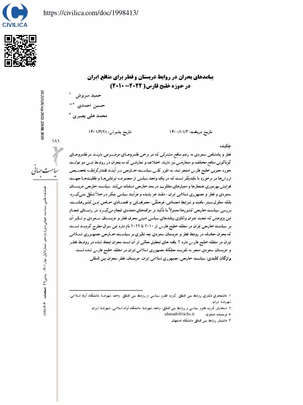پیامدهای بحران در روابط عربستان و قطر برای منافع ایران در حوزه خلیج فارس( ۲۰۲۲- ۲۰۱۰)