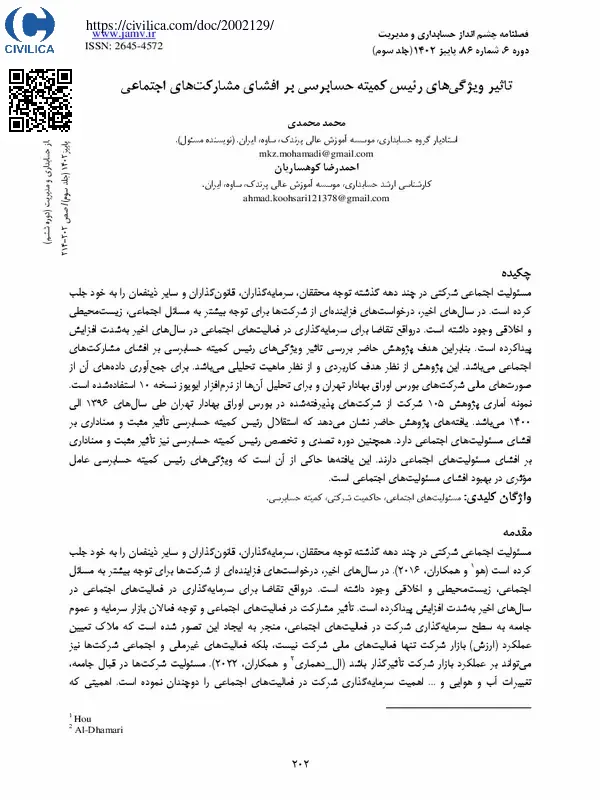 تاثیر ویژگی های رئیس کمیته حسابرسی بر افشای مشارکت های اجتماعی
