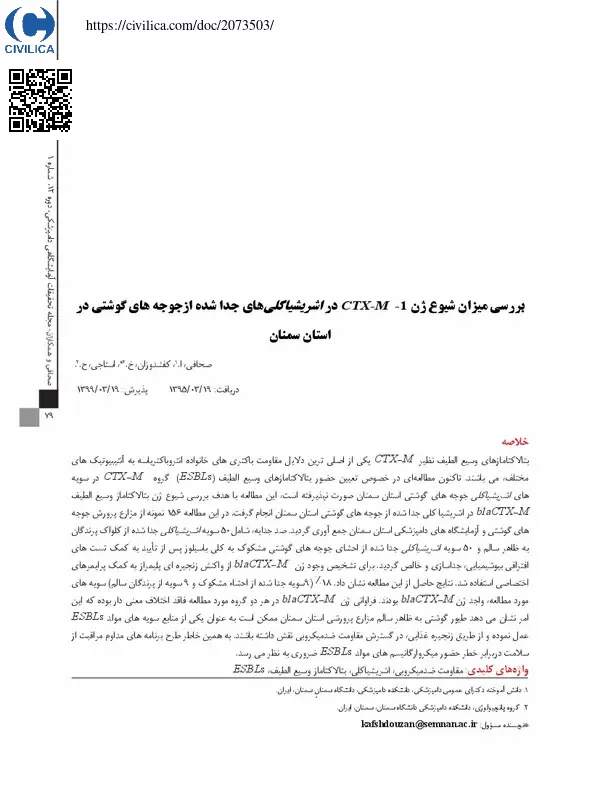 بررسی میزان شیوع ژن -۱ CTX-Mدر اشریشیاکلیهای جدا شده ازجوجه های گوشتی در استان سمنان