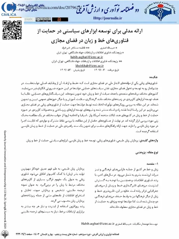 ارائه مدلی برای توسعه ابزارهای سیاستی در حمایت از فناوری های خط و زبان در فضای مجازی
