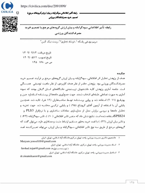 اثر اطلاعاتی، سودگرایانه و بیان ارزش گروه های مرجع با تصمیم خرید مصرف کنندگان ورزشی