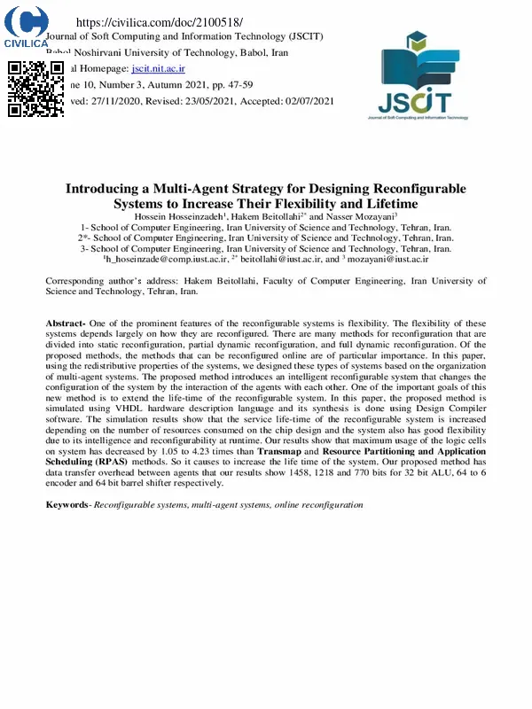 یکی از ویژگی های مهم و برجسته ی سیستم های قابل بازپیکربندی، انعطاف پذیری می باشد. انعطاف پذیری این دسته از سیستم ها وابستگی زیادی به نحوه ی بازپیکربندیشان دارد. روش های زیادی در راستای بازپیکربندی ارائه شده اند که به دسته های بازپیکربندی ایستا، بازپیکربندی پویای جزئی و بازپیکربندی پویای کامل تقسیم بندی می شوند. از بین روش -های ارائه شده روش هایی که قابلیت بازپیکربندی به صورت برخط را داشته باشند، از اهمیت ویژه ای برخوردار هستند. در این مقاله با استفاده از خاصیت توزیع پذیری سیستم های قابل بازپیکربندی، این دسته از سیستم ها را برمبنای سازمان سیستم های چندعامله طراحی کرده ایم. در روش پیشنهادی یک سیستم قابل بازپیکربندی هوشمند ارائه شده است که در زمان اجرای سیستم، عامل های هوشمند با تعامل و مذاکره با یکدیگر، بصورت خودمختار (مستقل از ابزار سنتز) پیکربندی سیستم را تغییر می دهند. یکی از هدف های مهم این روش جدید، افزایش طول عمر سیستم قابل بازپیکربندی می باشد. در این مقاله، شبیه سازی روش پیشنهادی با استفاده از زبان توصیف سخت افزار و سنتز آن با استفاده از نرم افزار Design Compiler انجام گردیده است. نتایج شبیه سازی نشان می دهد که حداکثر میزان فعالیت سلول ها با توجه به الگوها و الگوریتم های مورد ارزیابی، به میزان ۰۵/۱ الی ۲۳/۴ برابر نسبت به روش Transmap کاهش یافته و در نتیجه طول عمر سیستم قابل بازپیکربندی افزایش یافته است. همچنین روش پیشنهادی با توجه به تعامل بین عامل های هوشمند، شامل سربار تبادل پیام می باشد که مقادیر آن برای الگوریتم های ALU ۳۲ بیتی، رمزکننده ۶۴ به ۶ وShifter Barrel ۶۴ بیتی به ترتیب مطابق الگوهای تحت ارزیابی به طور میانگین ۱۴۵۸ ، ۱۲۱۸ و ۷۷۰ بیت بدست آمده است.