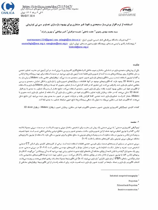 یکی از روش های سه بعدی سازی در شناسایی ساختار و عیوب داخلی اشیا مقطع نگاری کامپیوتری یا سی تی است. در این آزمون غیر مخرب، تصاویر حجمیو سایر مقاطع از روی پروجکشن های بدست آمده از تصویربرداری قطعه تحت آزمون بازسازی می شود. در صنعت استفاده برای تهیه پروجکشن ها از ایکس و گاما یا نوترون استفاده شده و سپس با الگوریتم های بازسازی تصویر، تصویر سه بعدی بدست می آید. نرم افزارهای خاصی مانند Muhrec و برش ساز سه بعدی یا ۳D slicer وجود دارند که الگوریتم های موجود در آنها، اطلاعات سینوگرام های تصویربرداری را بازسازی و ما کان نمایش سه بعدی و بررسی مقطعی تصاویر بازسازی شده را فراهم می کنند. این تحقیق که در ادامه کار قبلی است از تصاویر محوری که توسط نرم افزار Muhrec بازسازی و با استفاده از الگوریتم نفوذ غیر متقارن بهبود کیفیت یافته، برای بازسازی تصویر سه بعدی استفاده میکند. نتیا ج حاصل از رندرینگ تصاویر سه بعدی با نرم افزار۳D slicer نشان می دهد که در حالت پردازش اولیه تصاو یر با الگوریتم نفوذ غیر متقارن و بازسا زی آن با استفاده از تصاویر بازسازی شده محوری با Muhrec، مقدار کنتراست تصاویربازسازی شده حجمی کاملا افزایش یافته و جزئیات تصویر در تصویر سه بعدی بهتر دیده می شود. این نتایج نشانمی دهند که الگوریتم نفوذ غیر متقارن میتواند به عنوان یک صافی پروجکشن ها نتایج خوبی درایجاد تصاویر سه بعدی ایفا کند.
