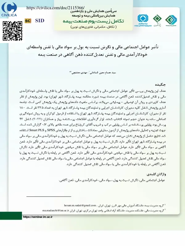 تاثیر عوامل اجتماعی مالی و نگرش نسبت به پول بر سواد مالی با نقش واسطه ای خودکارآمدی مالی و نقش تعدیل کننده ذهن آگاهی در صنعت بیمه
