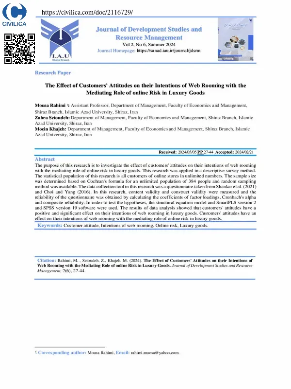هدف از این تحقیق بررسی تاثیر نگرش مشتریان بر تمایلات آنها از وب¬رومینگ با نقش میانجیگری ریسک آنلاین در کالاهای لوکس می باشد. این تحقیق از نوع کاربردی و به روش توصیفی پیمایشی انجام گردید. جامعه آماری تحقیق حاضر کلیه مشتریان فروشگاه های اینترنتی به تعداد نامحدود می باشد. حجم نمونه بر اساس فرمول کوکران برای جامعه نامحدود ۳۸۴ نفر تعیین شد و روش نمونه¬گیری تصادفی در دسترس بود. ابزار گردآوری اطلاعات در این تحقیق، پرسشنامه برگرفته از شانکار و همکاران (۲۰۲۱) و چوی و یانگ (۲۰۱۶) بود. در این پژوهش، روایی محتوا و روایی سازه، سنجش و بررسی شد و پایایی پرسشنامه از طریق محاسبه ضرایب بارهای عاملی، آلفای کرونباخ و پایایی ترکیبی به دست آمد. به منظور آزمون فرضیه ها از مدل معادلات ساختاری و نرم افزار SmartPLS نسخه ۲ و SPSS نسخه ۱۹ استفاده شد. نتایج تجزیه و تحلیل داده ها نشان داد که نگرش مشتریان بر تمایلات مشتریان از وب¬رومینگ با نقش میانجیگری ریسک آنلاین در کالاهای لوکس اثر دارد. نگرش مشتریان بر تمایلات آنها از وب¬رومینگ در کالاهای لوکس اثر مثبت و معنادار دارد. ریسک آنلاین بر تمایلات مشتریان از وب-رومینگ در کالاهای لوکس اثر معکوس و معنادار دارد. نگرش مشتریان بر ریسک آنلاین اثر معکوس و معنادار دارد.