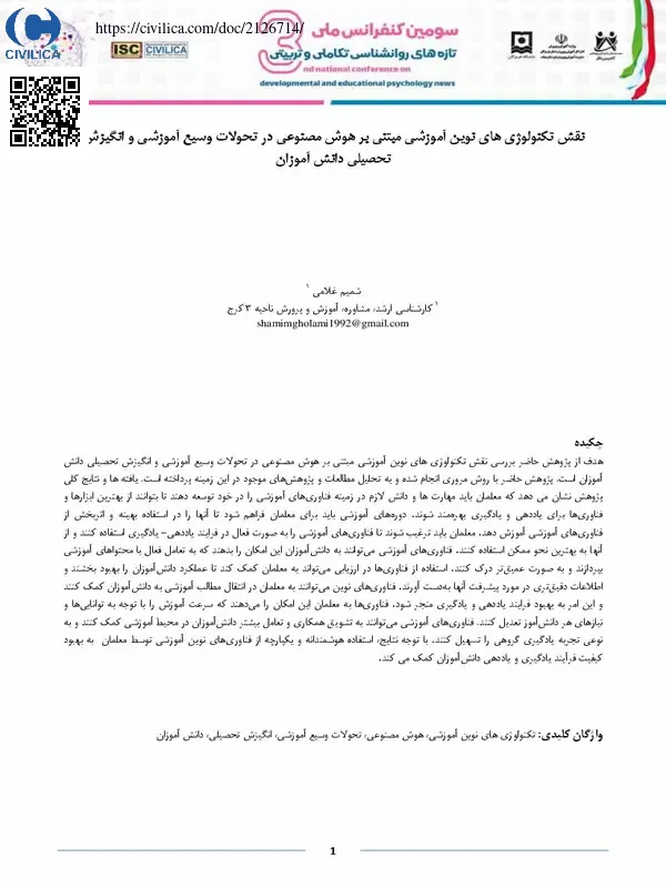 نقش تکنولوژی های نوین آموزشی مبتنی بر هوش مصنوعی در تحولات وسیع آموزشی و انگیزشتحصیلی دانش آموزان