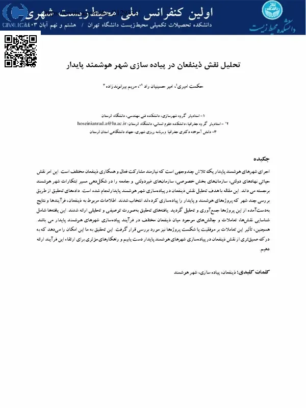 اجرای شهرهای هوشمند پایدار یک تلاش چندوجهی است که نیازمند مشارکت فعال و همکاری ذینفعان مختلف است. این امر نقش حیاتی نهادهای دولتی، سازمان های بخش خصوصی، سازمان های غیردولتی و جامعه را در شکل دهی مسیر ابتکارات شهر هوشمند برجسته می داند. این مقاله با هدف تحلیل نقش ذینفعان در پیاده سازی شهر هوشمند پایدارانجام شده است. داده های تحقیق از طریق بررسی چند شهر که پروژه های هوشمند و پایدار را پیاده سازی کرده اند انتخاب شدند. اطلاعات مربوط به ذینفعان، فرآیندها و نتایج به دست آمده از این پروژه ها جمع آوری و تحلیل گردید. یافته های تحقیق به صورت توصیفی و تحلیلی ارائه شدند. این یافته ها شامل شناسایی نقش ها، تعاملات و چالش های موجود میان ذینفعان مختلف در فرآیند پیاده سازی شهرهای هوشمند پایدار می باشد. همچنین، تاثیر این تعاملات بر موفقیت یا شکست پروژه ها نیز مورد بررسی قرار گرفت. این تحقیق به ما این امکان را می دهد که به درک عمیق تری از نقش ذینفعان در پیاده سازی شهرهای هوشمند پایدار دست یابیم و راهکارهای موثری برای ارتقاء این فرآیند ارائه دهیم.
