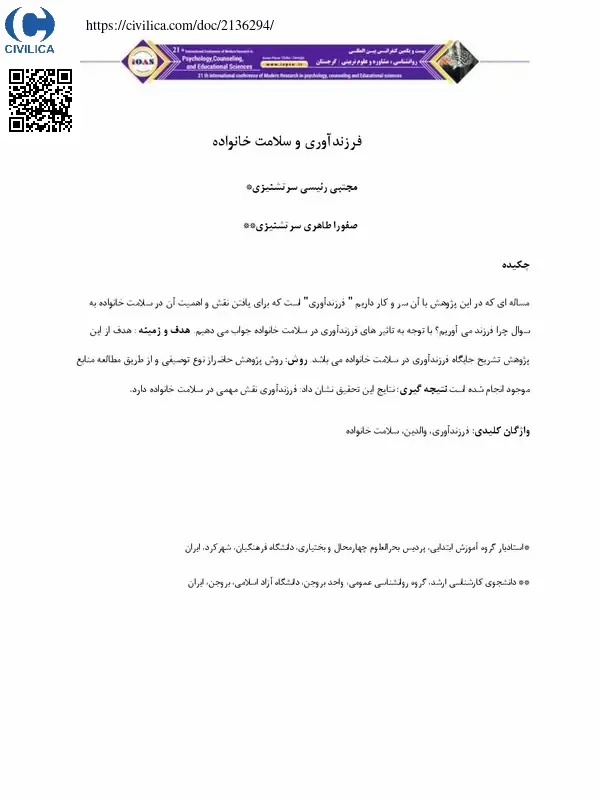 مساله ای که در این پژوهش با آن سر و کار داریم " فرزندآوری " است که برای یافتن نقش و اهمیت آن در سلامت خانواده به سوال چرا فرزند می آوریم ؟ با توجه به تاثیر های فرزندآوری در سلامت خانواده جواب می دهیم . هدف و زمینه : هدف از این پژوهش تشریح جایگاه فرزندآوری در سلامت خانواده می باشد. روش: روش پژوهش حاضراز نوع توصیفی و از طریق مطالعه منابع موجود انجام شده است .نتیجه گیری : نتایج این تحقیق نشان داد: فرزندآوری نقش مهمی در سلامت خانواده دارد.
