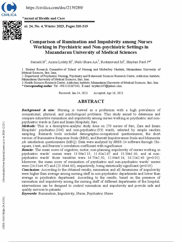 مقایسه نشخوار ذهنی و تکانشگری در پرستاران بخشهای روانپزشکی و غیر روانپزشکی دانشگاه علوم پزشکی مازندران
