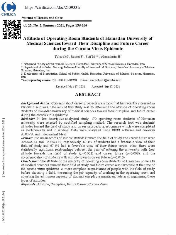 نگرش دانشجویان اتاق عمل دانشگاه علوم پزشکی همدان نسبت به رشته تحصیلی و آینده شغلی در زمان همه گیری ویروس کرونا