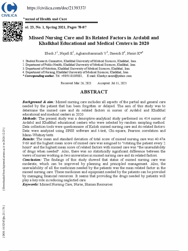 مراقبت فراموش شده و عوامل مرتبط با آن در پرستاران مراکز آموزشی- درمانی اردبیل و خلخال در سال ۱۳۹۹