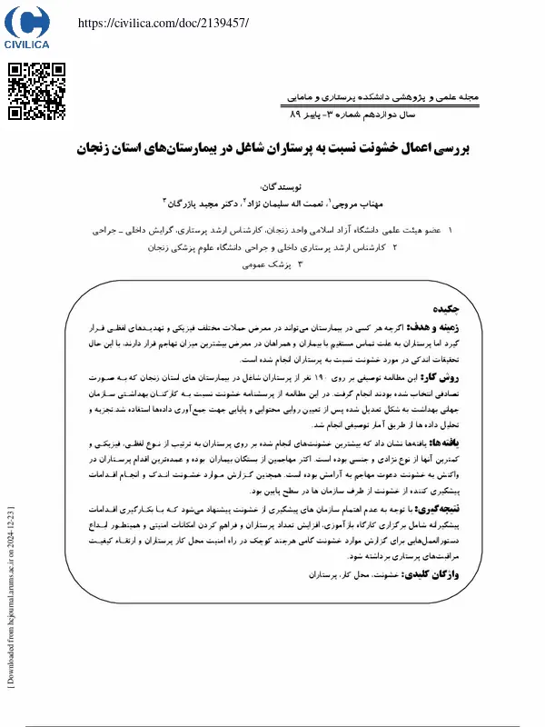 بررسی اعمال خشونت نسبت به پرستاران شاغل در بیمارستان های استان زنجان