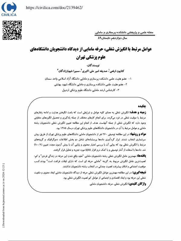 عوامل مرتبط با انگیزش شغلی، حرفه مامایی از دیدگاه دانشجویان دانشگاه های علوم پزشکی تهران