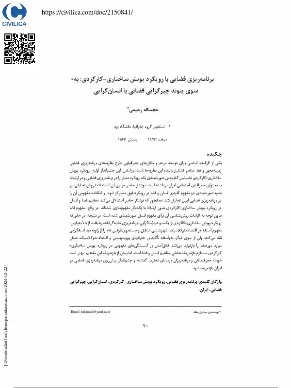 Spatial Planning ، SFD approach ، Humanism ، Spatial determinism ، Iran ، واژگان کلیدی: برنامهریزی فضایی ، رویکرد پویش ساختاری-کارکردی ، انسانگرایی ، جبرگرایی فضایی ، ایران