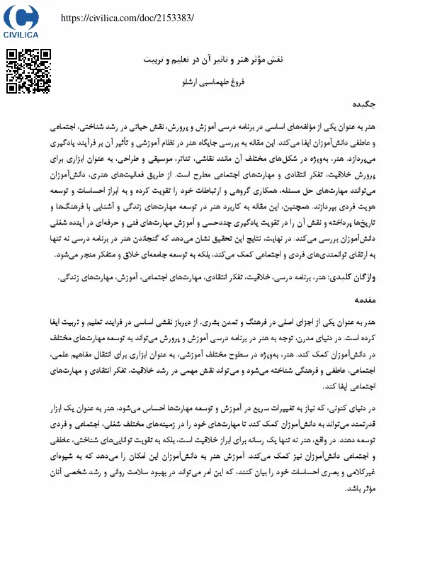 هنر به عنوان یکی از مولفه های اساسی در برنامه درسی آموزش و پرورش، نقش حیاتی در رشد شناختی، اجتماعی و عاطفی دانش آموزان ایفا می کند. این مقاله به بررسی جایگاه هنر در نظام آموزشی و تاثیر آن بر فرآیند یادگیری می پردازد. هنر، به ویژه در شکل های مختلف آن مانند نقاشی، تئاتر، موسیقی و طراحی، به عنوان ابزاری برای پرورش خلاقیت، تفکر انتقادی و مهارت های اجتماعی مطرح است. از طریق فعالیت های هنری، دانش آموزان می توانند مهارت های حل مسئله، همکاری گروهی و ارتباطات خود را تقویت کرده و به ابراز احساسات و توسعه هویت فردی بپردازند. همچنین، این مقاله به کاربرد هنر در توسعه مهارت های زندگی و آشنایی با فرهنگ ها و تاریخ ها پرداخته و نقش آن را در تقویت یادگیری چندحسی و آموزش مهارت های فنی و حرفه ای در آینده شغلی دانش آموزان بررسی می کند. در نهایت، نتایج این تحقیق نشان می دهد که گنجاندن هنر در برنامه درسی نه تنها به ارتقای توانمندی های فردی و اجتماعی کمک می کند، بلکه به توسعه جامعه ای خلاق و متفکر منجر می شود