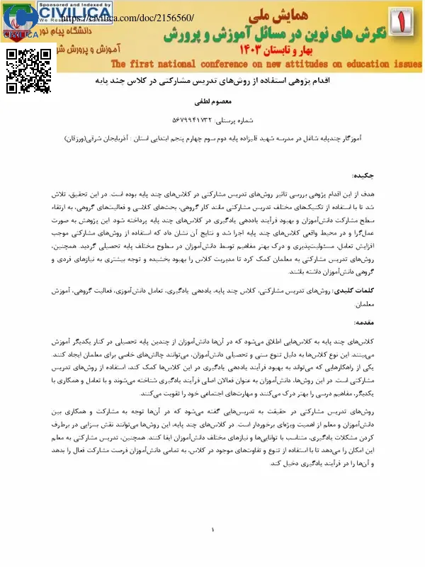 هدف از این اقدام پژوهی بررسی تاثیر روش های تدریس مشارکتی در کلاس های چند پایه بوده است. در این تحقیق، تلاش شد تا با استفاده از تکنیک های مختلف تدریس مشارکتی مانند کار گروهی، بحث های کلاسی و فعالیت های گروهی، به ارتقاء سطح مشارکت دانش آموزان و بهبود فرآیند یاددهی-یادگیری در کلاس های چند پایه پرداخته شود. این پژوهش به صورت عمل گرا و در محیط واقعی کلاس های چند پایه اجرا شد و نتایج آن نشان داد که استفاده از روش های مشارکتی موجب افزایش تعامل، مسئولیت پذیری و درک بهتر مفاهیم توسط دانش آموزان در سطوح مختلف پایه تحصیلی گردید. همچنین، روش های تدریس مشارکتی به معلمان کمک کرد تا مدیریت کلاس را بهبود بخشیده و توجه بیشتری به نیازهای فردی و گروهی دانش آموزان داشته باشند.