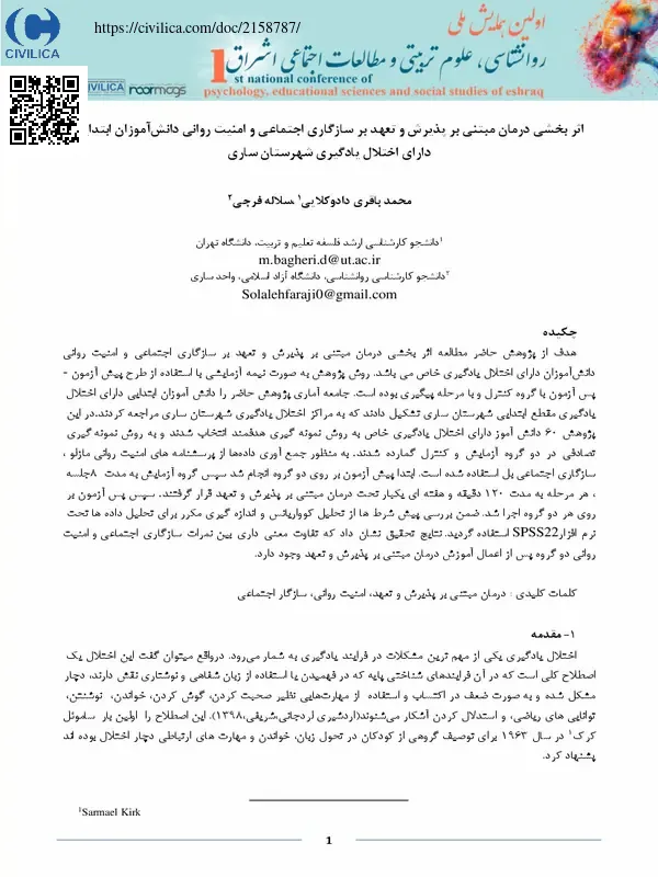 اثر بخشی درمان مبتنی بر پذیرش و تعهد بر سازگاری اجتماعی و امنیت روانی دانش آموزان ابتدایی دارای اختلال یادگیری شهرستان ساری