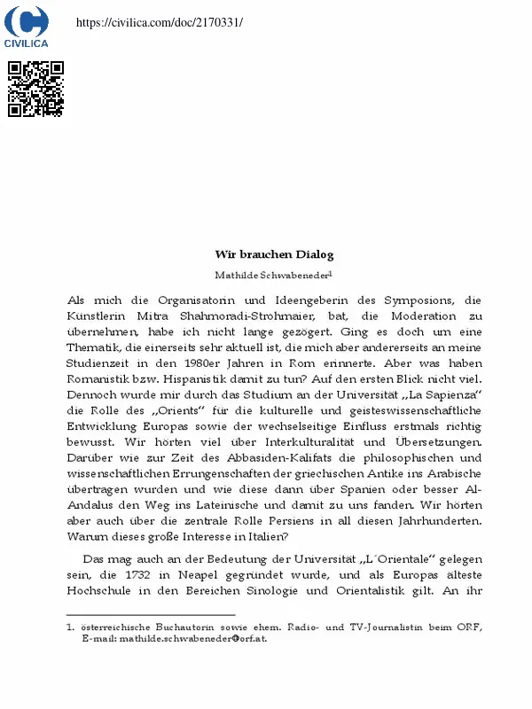 Ms. Mathilde Schwabeneder, whose connection to Iranian Studies datesback to her education period in Rome, believes that the main role of culturein international relations is to build a bridge between people of differentcountries. The author believes that, given the tensions in relations betweenthe Western and Islamic worlds over the past two decades and theemergence of signs of an end to globalization ideas, now is the time to starta new dialogue. There is a need to break down new and disruptive walls inthe cultural relations of nations, this time from a new perspective.
