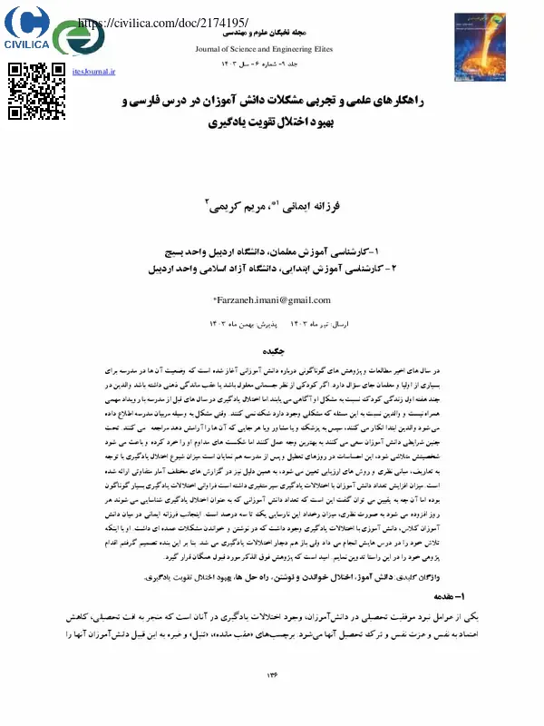 راهکارهای علمی و تجربی مشکلات دانش آموزان در درس فارسی و بهبود اختلال تقویت یادگیری