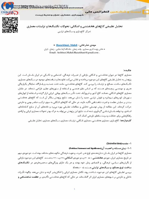 معماری کاخ ها در دوران هخامنشی و اشکانی بازتابی از تغییرات فرهنگی، اجتماعی و تکنیکی در ایران باستان است. این پژوهش به تحلیل تطبیقی کاخ های این دو دوره پرداخته و تلاش می کند تفاوت ها و شباهت های موجود در سبک های معماری، تکنیک های ساخت، مصالح، و تزئینات را بررسی کند. کاخ های هخامنشی، مانند تخت جمشید و پاسارگاد، نمایانگر یکپارچگی هنری و مهندسی پیچیده ای هستند که بر اساس نظم هندسی و استفاده از ستون های عظیم طراحی شده اند. در مقابل، معماری کاخ های اشکانی، همانند کاخ آشور و فیروزآباد، تحت تاثیر سبک های یونانی-ایرانی قرار گرفته و استفاده از ایوان های ستون دار، قوس های نیم دایره و نقوش تزئینی جدید را نشان می دهد. نتایج پژوهش بیانگر آن است که کاخ های هخامنشی بیشتر بر نمایش عظمت و قدرت شاهنشاهی تاکید دارند، در حالی که کاخ های اشکانی به سوی ترکیب عناصر بومی و خارجی حرکت کرده اند. این مطالعه از روش توصیفی-تحلیلی و مطالعات تطبیقی بهره می برد و داده های آن از منابع کتابخانه ای، اسنادی، و شواهد باستان شناسی گردآوری شده است. نتایج این پژوهش می تواند به درک بهتر تحولات معماری ایرانی و ارائه ی راهکارهایی برای حفاظت و مرمت بناهای تاریخی کمک کند.