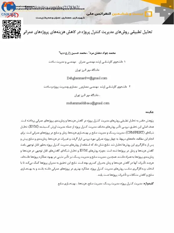 پژوهش حاضر به تحلیل تطبیقی روش های مدیریت کنترل پروژه در کاهش هزینه ها و زمان بندی پروژه های عمرانی پرداخته است. هدف اصلی این تحقیق، بررسی تاثیر روش های مختلف مدیریت کنترل پروژه از جمله مدیریت ارزش کسب شده (EVM)، تحلیل شبکه ای (CPM/PERT)، مدیریت ریسک و مدیریت منابع بر بهینه سازی هزینه ها، زمان و منابع در پروژه های عمرانی است. برای انجام این مطالعه، داده های مربوط به چهار پروژه عمرانی مورد بررسی قرار گرفت و تغییرات در هزینه ها، زمان بندی و منابع پیش و پس از به کارگیری این روش ها تحلیل شد. نتایج نشان داد که استفاده از روش های مدیریت کنترل پروژه به طور قابل توجهی باعث کاهش هزینه ها و زمان در پروژه ها شده است. به ویژه روش های EVM و تحلیل شبکه ای کاهش های قابل توجهی در هزینه ها و زمان بندی پروژه ها به همراه داشتند. همچنین، مدیریت منابع و مدیریت ریسک نیز تاثیر مثبتی در بهبود عملکرد پروژه ها داشته اند، هرچند تاثیرات آنها در کاهش هزینه ها و زمان به میزان کمتری بوده است. نتایج این تحقیق به مدیران پروژه ها کمک می کند تا با انتخاب و به کارگیری مناسب روش های مدیریت کنترل پروژه، عملکرد بهتری در پروژه های عمرانی داشته باشند و به بهینه سازی منابع و کاهش مشکلات و تاخیرات پروژه ها دست یابند.