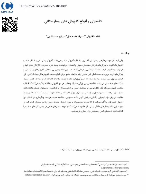 یکی از مسائل مهم در طراحی بیمارستان، کفسازی و انتخاب کفپوش مناسب می باشد. کفپوش بیمارستان و انتخاب مناسب کفپوشها با توجه به ویژگیهای فیزیکی، بهداشتی، صوتی و اقتصادی می تواند به بهبود تجربه بیماران و کارکنان منجر شود و در نهایت به افزایش کیفیت خدمات بهداشتی و درمانی کمک کند. این مقاله به بررسی و تحلیل کفپوشهای بیمارستانی و ویژگیهای آنها می پردازد. هدف اصلی این تحقیق ارائه اطلاعات جامع درباره انواع مختلف کفپوشها از جمله اپوکسی، پلی اورتان، پی وی سی، لمینت و پارکت است؛ که جمع آوری این داده ها توسط مطالعات کتابخانه ای از مقالات، کتاب و سایت شرکت های ساختمانی می باشد. مقاله به بررسی ویژگیها، مزایا و معایب هر نوع کفپوش پرداخته و تاکید می کند که انتخاب مناسب کفپوش می تواند تاثیر قابل توجهی بر بهداشت، ایمنی و راحتی بیماران و کارکنان در محیط های درمانی داشته باشد. نتایج نشان می دهد که کفپوشهای بیمارستانی باید دارای ویژگیهای خاصی مانند مقاومت در برابر آب، ضد باکتری بودن، مقاومت در برابر مواد شیمیایی و آسانی در تمیز کردن باشند. همچنین، مقاله به اهمیت هزینه ها و نگهداری در انتخاب نوع کفپوش اشاره کرده و تاکید می کند که انتخاب صحیح می تواند به بهبود کیفیت خدمات درمانی و تجربه بیماران کمک کند. در نهایت، این مقاله به طراحان داخلی بیمارستان ها توصیه می کند که با توجه به نیازهای خاص هر بخش، گزینه های مناسب را انتخاب کنند تا محیطی ایمن و بهداشتی برای بیماران فراهم شود.