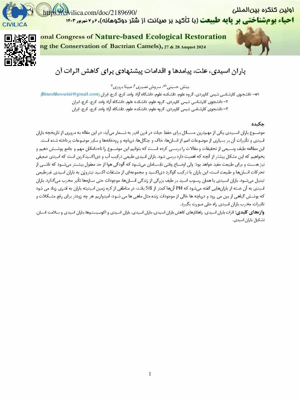 موضوع باران اسیدی یکی از مهمترین مسائل برای حفظ حیات در قرن اخیر به شمار می آید؛ در این مقاله به مروری از تاریخچه باران اسیدی و تاثیرات آن بر بسیاری از موضوعات اعم از انسان ها، خاک و جنگ ها، دریاچه و رودخانه ها و سایر موضوعات پرداخته شده است. این مطالعه طیف وسیعی از تحقیقات و مقالات را بررسی کرده است که بتوانیم این موضوع را تا حدامکان مهم و جامع پوشش دهیم و بخواهیم که این مسئله بیشتر از آنچه که اهمیت دارد بررسی شود. باران اسیدی طبیعی ترکیب آب و دی اکسید کربن است که اسیدی ضعیفی نیز هست و برای طبیعت مفید خواهد بود؛ ولی وقتی نابسامان می شود که آلودگی هوا از حد معقول بیشتر می شود که ناشی از تحرکات انسان ها و طبیعت است، این باران با ترکیب گوگرد دی اکسید و مجموعه ای از مواد اکسید نیتروژن به باران اسیدی غیرطبیعی تبدیل می شود. باران اسیدی یا همان رسوب اسید بر طیف بزرگی از زندگی انسان ها، موجودات حتی سوازه ها تاثیر مخرب می گذارد. باران اسیدی به آن دسته از باران هایی گفته می شود که PH آنها کمتر از ۵.۶ باشد؛ در مناطقی از کره زمین اسیدیته باران به قدری زیاد می شود که پوشش گیاهی از بین می رود و دریاچه ها خالی از موجودات زنده مثل ماهی ها می شود؛ امیدواریم هر چه زودتر برای رفع مشکلات و تاثیرات مخرب باران اسیدی راه حلی صورت بگیرد.