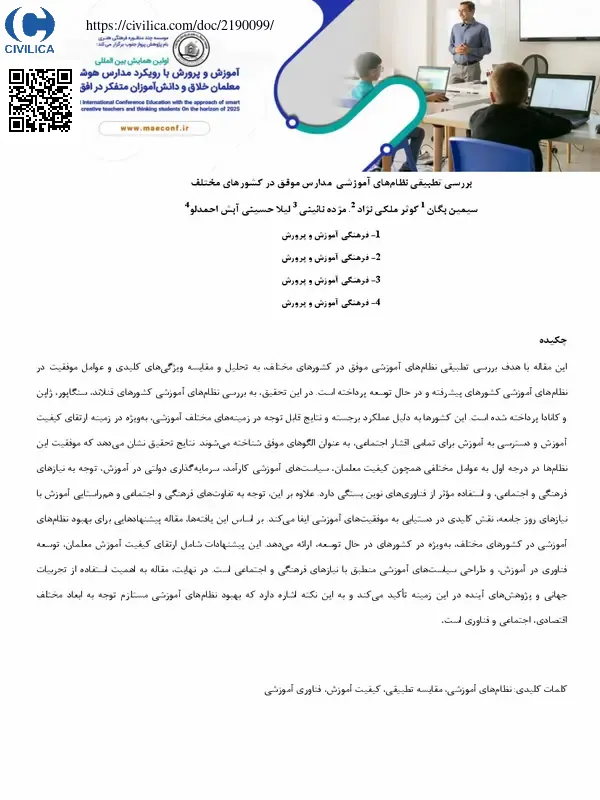 این مقاله با هدف بررسی تطبیقی نظام های آموزشی موفق در کشورهای مختلف، به تحلیل و مقایسه ویژگی های کلیدی و عوامل موفقیت در نظام های آموزشی کشورهای پیشرفته و در حال توسعه پرداخته است. در این تحقیق، به بررسی نظام های آموزشی کشورهای فنلاند، سنگاپور، ژاپن و کانادا پرداخته شده است. این کشورها به دلیل عملکرد برجسته و نتایج قابل توجه در زمینه های مختلف آموزشی، به ویژه در زمینه ارتقای کیفیت آموزش و دسترسی به آموزش برای تمامی اقشار اجتماعی، به عنوان الگوهای موفق شناخته می شوند. نتایج تحقیق نشان می دهد که موفقیت این نظام ها در درجه اول به عوامل مختلفی همچون کیفیت معلمان، سیاست های آموزشی کارآمد، سرمایه گذاری دولتی در آموزش، توجه به نیازهای فرهنگی و اجتماعی، و استفاده موثر از فناوری های نوین بستگی دارد. علاوه بر این، توجه به تفاوت های فرهنگی و اجتماعی و هم راستایی آموزش با نیازهای روز جامعه، نقش کلیدی در دستیابی به موفقیت های آموزشی ایفا می کند. بر اساس این یافته ها، مقاله پیشنهادهایی برای بهبود نظام های آموزشی در کشورهای مختلف، به ویژه در کشورهای در حال توسعه، ارائه می دهد. این پیشنهادات شامل ارتقای کیفیت آموزش معلمان، توسعه فناوری در آموزش، و طراحی سیاست های آموزشی منطبق با نیازهای فرهنگی و اجتماعی است. در نهایت، مقاله به اهمیت استفاده از تجربیات جهانی و پژوهش های آینده در این زمینه تاکید می کند و به این نکته اشاره دارد که بهبود نظام های آموزشی مستلزم توجه به ابعاد مختلف اقتصادی، اجتماعی و فناوری است.