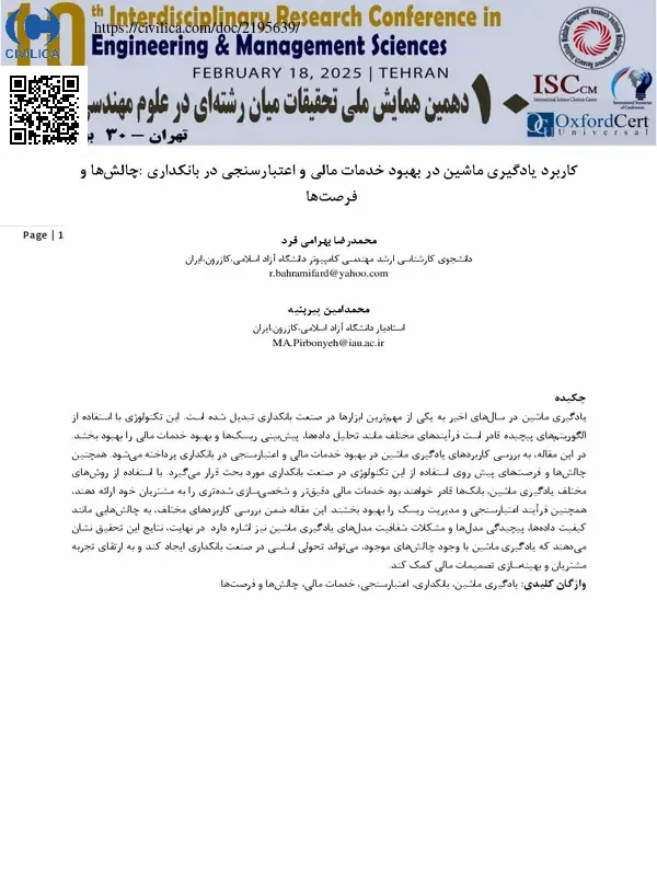 یادگیری ماشین در سالهای اخیر به یکی از مهمترین ابزارها در صنعت بانکداری تبدیل شده است. این تکنولوژی با استفاده از الگوریتم های پیچیده قادر است فرآیندهای مختلف مانند تحلیل داده ها، پیش بینی ریسک ها و بهبود خدمات مالی را بهبود بخشد. در این مقاله، به بررسی کاربردهای یادگیری ماشین در بهبود خدمات مالی و اعتبارسنجی در بانکداری پرداخته می شود. همچنین چالش ها و فرصت های پیش روی استفاده از این تکنولوژی در صنعت بانکداری مورد بحث قرار می گیرد. با استفاده از روش های مختلف یادگیری ماشین، بانک ها قادر خواهند بود خدمات مالی دقیق تر و شخصی سازی شده تری را به مشتریان خود ارائه دهند، همچنین فرآیند اعتبارسنجی و مدیریت ریسک را بهبود بخشند. این مقاله ضمن بررسی کاربردهای مختلف، به چالش هایی مانند کیفیت داده ها، پیچیدگی مدل ها و مشکلات شفافیت مدل های یادگیری ماشین نیز اشاره دارد. در نهایت، نتایج این تحقیق نشان می دهند که یادگیری ماشین با وجود چالش های موجود، می تواند تحولی اساسی در صنعت بانکداری ایجاد کند و به ارتقای تجربه مشتریان و بهینه سازی تصمیمات مالی کمک کند.