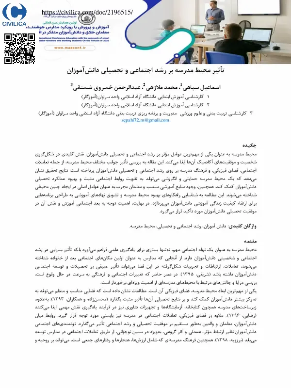 محیط مدرسه به عنوان یکی از مهم ترین عوامل موثر بر رشد اجتماعی و تحصیلی دانش آموزان، نقش کلیدی در شکل گیری شخصیت و موفقیت های آکادمیک آن ها ایفا می کند. این مقاله به بررسی تاثیر جوانب مختلف محیط مدرسه، از جمله تعاملات اجتماعی، فضای فیزیکی، و فرهنگ مدرسه بر روی رشد اجتماعی و تحصیلی دانش آموزان پرداخته است. نتایج تحقیق نشان می دهد که یک محیط مدرسه حمایتی و انگیزشی می تواند به تقویت روابط اجتماعی مثبت و بهبود عملکرد تحصیلی دانش آموزان کمک کند. همچنین، وجود منابع آموزشی مناسب و معلمان مجرب به عنوان عوامل اصلی در ایجاد چنین محیطی شناخته می شوند. این مطالعه به شناسایی راهکارهای بهبود محیط مدرسه و تشویق نهادهای آموزشی به طراحی برنامه هایی برای ارتقاء کیفیت زندگی آموزشی دانش آموزان می پردازد. در نهایت، اهمیت توجه به بعد اجتماعی آموزش و نقش آن در موفقیت تحصیلی دانش آموزان مورد تاکید قرار می گیرد.