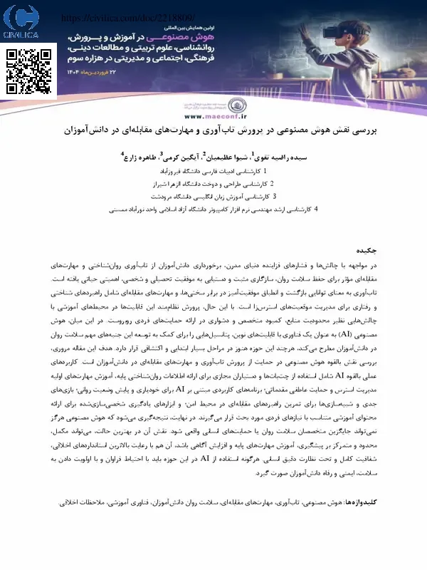 هوش مصنوعی ، تاب آوری ، مهارت های مقابله ای ، سلامت روان دانش آموزان ، فناوری آموزشی ، ملاحظات اخلاقی