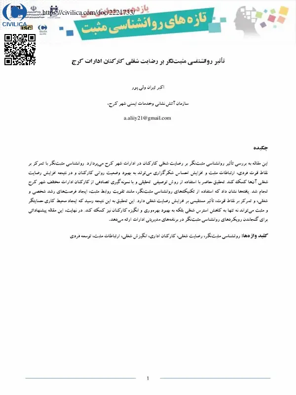 این مقاله به بررسی تاثیر روانشناسی مثبتنگر بر رضایت شغلی کارکنان در ادارات شهر کرج می پردازد. روانشناسی مثبتنگر با تمرکز بر نقاط قوت فردی، ارتباطات مثبت و افزایش احساس شکرگزاری می تواند به بهبود وضعیت روانی کارکنان و در نتیجه افزایش رضایت شغلی آنها کمک کند. تحقیق حاضر با استفاده از روش توصیفی-تحلیلی و با نمونه گیری تصادفی از کارکنان ادارات مختلف شهر کرج انجام شد. یافته ها نشان داد که استفاده از تکنیک های روانشناسی مثبتنگر، مانند تقویت روابط مثبت، ایجاد فرصت های رشد شخصی و شغلی، و تمرکز بر نقاط قوت، تاثیر مستقیمی بر افزایش رضایت شغلی دارد. این تحقیق به این نتیجه رسید که ایجاد محیط کاری حمایتگر و مثبت می تواند نه تنها به کاهش استرس شغلی بلکه به بهبود بهره وری و انگیزه کارکنان نیز کمک کند. در نهایت، این مقاله پیشنهاداتی برای گنجاندن رویکردهای روانشناسی مثبتنگر در برنامه های مدیریتی ادارات ارائه می دهد.