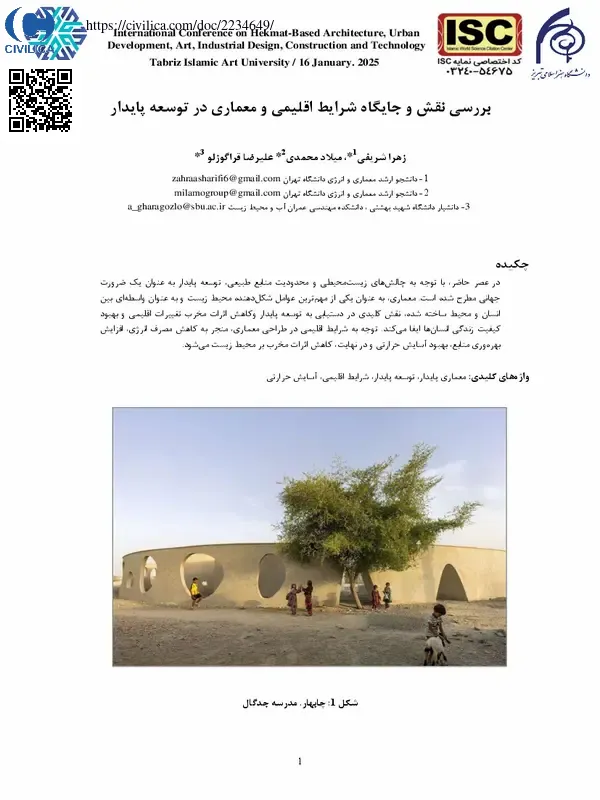 محیطی و محدودیت منابع طبیعی، توسعه پایدار به عنوان یک ضرورت های زیست در عصر حاضر، با توجه به چالش ای بین به عنوان واسطهو دهنده محیط زیست ترین عوامل شکل، به عنوان یکی از مهمجهانی مطرح شده است. معماری کاهش اثرات مخرب تغییرات اقلیمی و بهبود و ساخته شده، نقش کلیدی در دستیابی به توسعه پایدار انسان و محیط ه کاهش مصرف انرژی، افزایش توجه به شرایط اقلیمی در طراحی معماری، منجر ب. کند ایفا می ها کیفیت زندگی انسان شود. اثرات مخرب بر محیط زیست میوری منابع، بهبود آسایش حرارتی و در نهایت، کاهش بهره