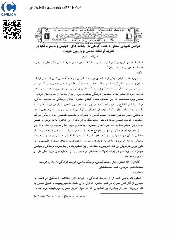 خوانش تطبیقی اسطوره جفت گیاهی در چکامه های ادونیس و شاملو با تکیه بر نظریه فرهنگ شناسی و بازیابی هویت