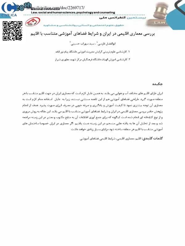 ایران دارای اقلیم های مختلف آب و هوایی می باشد. به همین دلیل لازم است که معماری ایران در جهت اقلیم متناسب با هر منطقه صورت گیرد. طرلحی فضاهای آموزشی هم از این قاعده مستثنی نیستند، زیرا به دلیل استفاده مدام لازم است به معماری آن توجه بیشتری نمود تا کیفیت آموزش و یادگیری و صرفه جویی در مصرف انرژی صورت پذیرد. هدف از انجام پژوهش حاضر بررسی معماری اقلیمی در ایران و شرایط فضاهای آموزشی متناسب با اقلیم می باشد. این مقاله به روش مروری و از نوع کتابخانه ای انجام شده است. اینگونه که برای جمع آوری اطلاعات آن به منابع مکتوب و معتبر در این زمینه مراجعه شد و بعد از تحلیل آن ها به یافته هایی منسجم در این زمینه دست یافتیم. اگر معماری در ایران خصوصا ساختمان های آموزشی متناسب با اقلیم هر منطقه ساخته شود مزایای بسیار زیادی خواهد داشت.
