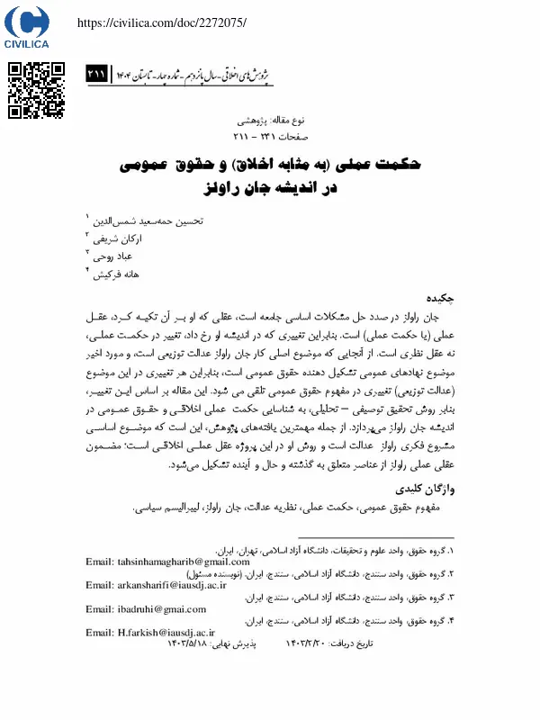 جان راولز در صدد حل مشکلات اساسی جامعه است، عقلی که او بر آن تکیه کرد، عقل عملی (یا حکمت عملی) است. بنابراین تغییری که در اندیشه او رخ داد، تغییر در حکمت عملی، نه عقل نظری است. از آنجایی که موضوع اصلی کار جان راولز عدالت توزیعی است، و مورد اخیر موضوع نهادهای عمومی تشکیل دهنده حقوق عمومی است، بنابراین هر تغییری در این موضوع (عدالت توزیعی) تغییری در مفهوم حقوق عمومی تلقی می شود. این مقاله بر اساس این تغییر، بنابر روش تحقیق توصیفی – تحلیلی، به شناسایی حکمت عملی اخلاقی و حقوق عمومی در اندیشه جان راولز می¬پردازد. از جمله مهمترین یافته¬های پژوهش، این است که موضوع اساسی مشروع فکری راولز عدالت است و روش او در این پروژه عقل عملی اخلاقی است؛ مضمون عقلی عملی راولز از عناصر متعلق به گذشته و حال و آینده تشکیل می¬شود.