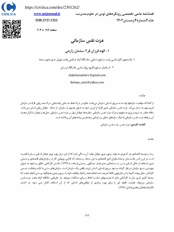 از آنجا که موفقیت سازمانها وابسته به نیروی انسانی سازمان می باشد، علاوه بر درک ابعاد جسمانی واجتماعی، درک بعد روانی افراد در سازمان امری مهم به شمار می آید. عزت نفس سازمانی تصور افراد از ارزش خود به عنوان عضوی از سازمان، از جمله عوامل روانی انسان می باشد. مقاله حاضر به شیوه مروری به مفهوم و درک عزت نفس سازمانی ، نظریه ها ،عوامل موثر بر عزت نفس سازمانی، مدل ها و عوامل تشکیل دهنده آن و رابطه عزت نفس سازمانی با دیگر سازه های شغلی و سازمانی و همچنین پیامدهای آن پرداخته است.