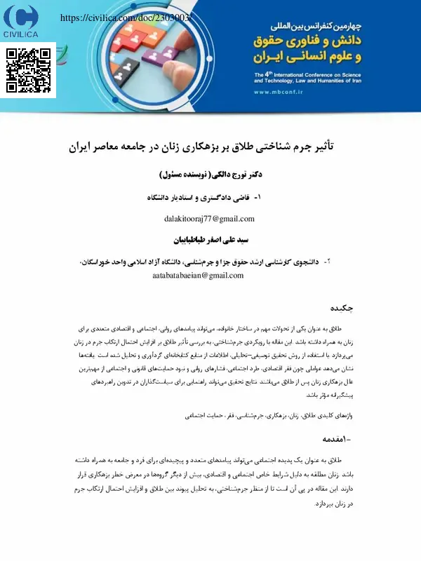 طلاق به عنوان یکی از تحولات مهم در ساختار خانواده، می تواند پیامدهای روانی، اجتماعی و اقتصادی متعددی برای زنان به همراه داشته باشد. این مقاله با رویکردی جرم شناختی، به بررسی تاثیر طلاق بر افزایش احتمال ارتکاب جرم در زنان می پردازد. با استفاده از روش تحقیق توصیفی-تحلیلی، اطلاعات از منابع کتابخانه ای گردآوری و تحلیل شده است. یافته ها نشان می دهد عواملی چون فقر اقتصادی، طرد اجتماعی، فشارهای روانی و نبود حمایت های قانونی و اجتماعی از مهمترین علل بزهکاری زنان پس از طلاق می باشند. نتایج تحقیق می تواند راهنمایی برای سیاستگذاران در تدوین راهبردهای پیشگیرانه موثر باشد.