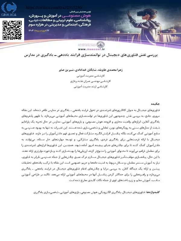 فناوری های دیجیتال به عنوان کاتالیزورهای قدرتمندی در تحول فرایند یاددهی یادگیری در مدارس ظاهر شده اند. این مقاله مروری جامع، به بررسی نقش چندوجهی این فناوری ها در توانمندسازی محیط های آموزشی می پردازد. با ظهور پلتفرم های یادگیری آنلاین، ابزارهای واقعیت مجازی و افزوده، هوش مصنوعی، و بازی های آموزشی، مدارس در حال تجربه یک پارادایم شیفت از مدل های سنتی به رویکردهای نوین، تعاملی و شخصی سازی شده هستند. این تغییرات نه تنها به بهبود دسترسی به منابع آموزشی کمک می کنند، بلکه پتانسیل افزایش انگیزه، مشارکت فعال و تعمیق فهم دانش آموزان را نیز دارند. فناوری های دیجیتال با ارائه فرصت هایی برای یادگیری فردی، یادگیری مشارکتی، و توسعه مهارت های حل مسئله، می توانند به دانش آموزان کمک کنند تا برای چالش های دنیای پیچیده امروز آماده شوند. همچنین، این فناوری ها ابزارهای قدرتمندی را برای معلمان فراهم می آورند تا محتوای آموزشی را متنوع تر کرده، ارزیابی ها را بهینه سازی کنند و بازخورد موثرتری ارائه دهند. با این حال، پیاده سازی موفقیت آمیز فناوری های دیجیتال مستلزم درک عمیق چالش هایی از جمله دسترسی نابرابر به فناوری، نیاز به آموزش مستمر معلمان، و مسائل مربوط به امنیت داده ها و حریم خصوصی است. این مقاله با ترکیب یافته های تحقیقات پیشین و ارائه یک دیدگاه کلان، به بررسی مزایا و چالش های ادغام فناوری های دیجیتال در فرایند یاددهی یادگیری می پردازد و راهبردهایی را برای حداکثر کردن پتانسیل آنها در محیط های آموزشی ارائه می دهد. تاکید بر طراحی آموزشی مناسب، آموزش معلم، و زیرساخت های قوی از جمله نکات کلیدی مطرح شده است.