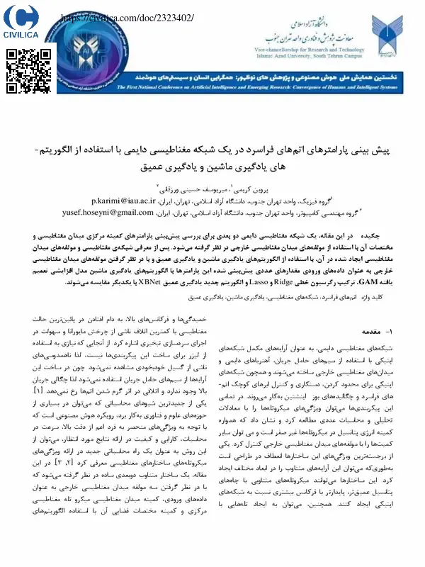 در این مقاله، یک شبکه مغناطیسی دایمی دو بعدی برای بررسی پیشبینی پارامترهای کمینه مرکزی میدان مغناطیسی و مختصات آن با استفاده از مولفه های میدان مغناطیسی خارجی در نظر گرفته می شود. پس از معرفی شبکه ی مغناطیسی و مولفه های میدان مغناطیسی ایجاد شده در آن، با استفاده از الگوریتم های یادگیری ماشین و یادگیری عمیق و با در نظر گرفتن مولفه های میدان مغناطیسی خارجی به عنوان داده های ورودی، مقادیر عددی پیشبینی شده این پارامترها با الگوریتم های یادگیری ماشین مدل افزایشی تعمیم یافته GAM، ترکیب رگرسیون خطی Ridge و Lasso و الگوریتم جدید یادگیری عمیق XBNet با یکدیگر مقایسه می شوند.