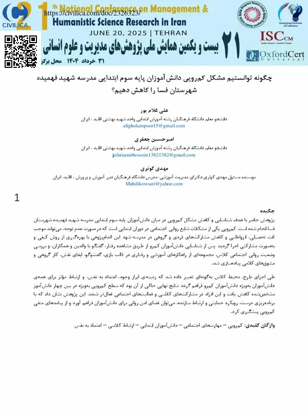 چکیده پژوهش حاضر با هدف شناسایی و کاهش مشکل کم رویی در میان دانش آموزان پایه سوم ابتدایی مدرسه شهید فهمیده شهرستان فسا انجام شده است. کم رویی یکی از مشکلات شایع روانی-اجتماعی در دوران ابتدایی است که در صورت عدم توجه، می تواند موجب افت تحصیلی، انزواطلبی و کاهش مشارکت های فردی و گروهی در مدرسه شود. این اقدام پژوهی با بهره گیری از روش کیفی و به صورت مشارکتی اجرا گردید. پس از شناسایی دانش آموزان کم رو از طریق مشاهده رفتار، گفتگو با والدین و همکاران، و بررسی وضعیت روانی-اجتماعی کلاس، مجموعه ای از راهکارهای آموزشی و رفتاری در قالب بازی، گفت وگو، ایفای نقش، کار گروهی و مشوق های کلامی پیاده سازی شد. طی اجرای طرح، محیط کلاس به گونه ای تغییر داده شد که زمینه ی ابراز وجود، اعتماد به نفس، و ارتباط موثر برای همه ی دانش آموزان به ویژه دانش آموزان کم رو فراهم گردد. نتایج نهایی حاکی از آن بود که سطح کم رویی به ویژه در بین چهار دانش آموز مشخص شده کاهش یافت و این افراد در مشارکت های کلاسی و فعالیت های اجتماعی فعال تر شدند. این پژوهش نشان داد که با برنامه ریزی درست، رویکرد حمایتی و ارتباط سازنده، می توان فضای امن روانی برای دانش آموزان فراهم آورد و از پیامدهای منفی کم رویی پیشگیری کرد.