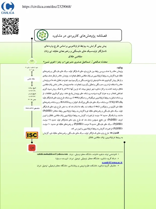 پیش بینی گرایش به روابط فرازناشویی براساس طرح واره های ناسازگار اولیه،سبک های دلبستگی و راهبردهای مقابله ای زنان متقاضی طلاق