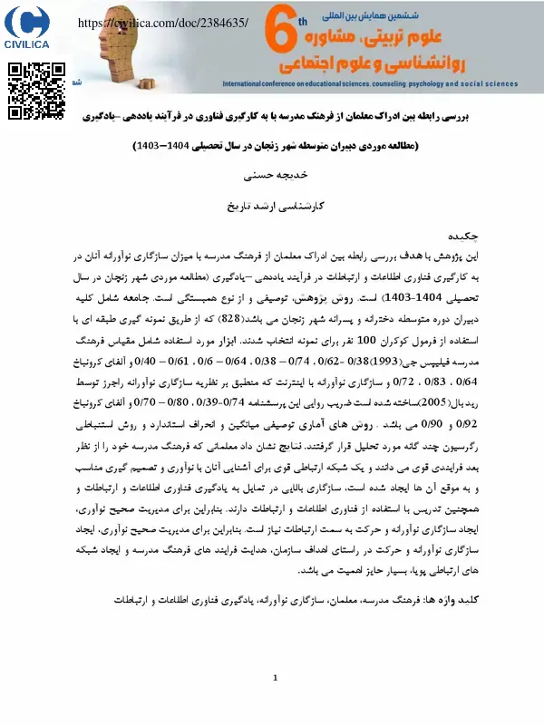 بررسی رابطه بین ادراک معلمان از فرهنگ مدرسه با به کارگیری فناوری در فرآیند یاددهی –یادگیری (مطالعه موردی دبیران متوسطه شهر زنجان در سال تحصیلی ۱۴۰۴-۱۴۰۳)