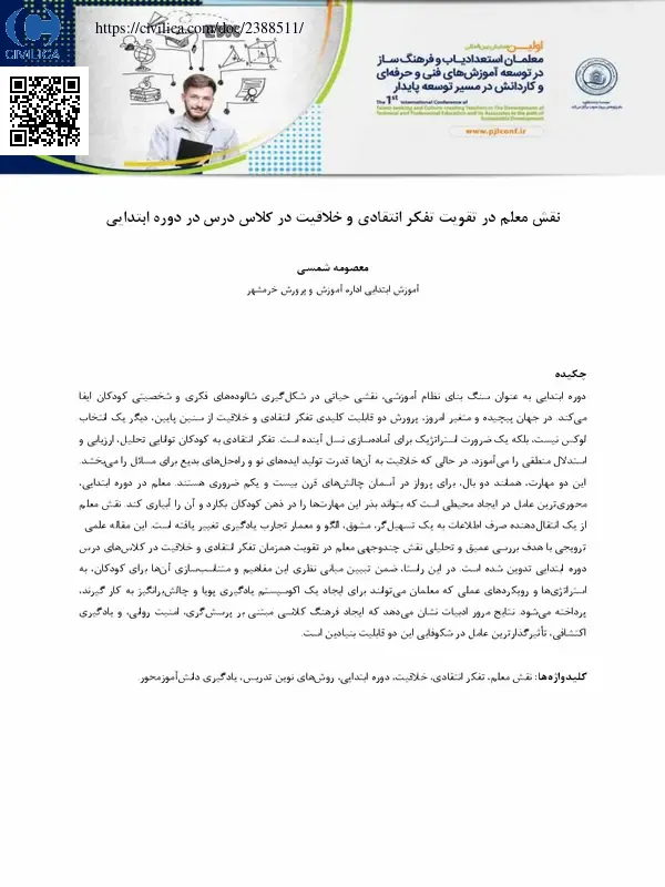 دوره ابتدایی به عنوان سنگ بنای نظام آموزشی، نقشی حیاتی در شکل گیری شالوده های فکری و شخصیتی کودکان ایفا می کند. در جهان پیچیده و متغیر امروز، پرورش دو قابلیت کلیدی تفکر انتقادی و خلاقیت از سنین پایین، دیگر یک انتخاب لوکس نیست، بلکه یک ضرورت استراتژیک برای آماده سازی نسل آینده است. تفکر انتقادی به کودکان توانایی تحلیل، ارزیابی و استدلال منطقی را می آموزد، در حالی که خلاقیت به آن ها قدرت تولید ایده های نو و راه حل های بدیع برای مسائل را می بخشد. این دو مهارت، همانند دو بال، برای پرواز در آسمان چالش های قرن بیست و یکم ضروری هستند. معلم در دوره ابتدایی، محوری ترین عامل در ایجاد محیطی است که بتواند بذر این مهارت ها را در ذهن کودکان بکارد و آن را آبیاری کند. نقش معلم از یک انتقال دهنده صرف اطلاعات به یک تسهیل گر، مشوق، الگو و معمار تجارب یادگیری تغییر یافته است. این مقاله علمی-ترویجی با هدف بررسی عمیق و تحلیلی نقش چندوجهی معلم در تقویت همزمان تفکر انتقادی و خلاقیت در کلاس های درس دوره ابتدایی تدوین شده است. در این راستا، ضمن تبیین مبانی نظری این مفاهیم و متناسب سازی آن ها برای کودکان، به استراتژی ها و رویکردهای عملی که معلمان می توانند برای ایجاد یک اکوسیستم یادگیری پویا و چالش برانگیز به کار گیرند، پرداخته می شود. نتایج مرور ادبیات نشان می دهد که ایجاد فرهنگ کلاسی مبتنی بر پرسش گری، امنیت روانی، و یادگیری اکتشافی، تاثیرگذارترین عامل در شکوفایی این دو قابلیت بنیادین است.