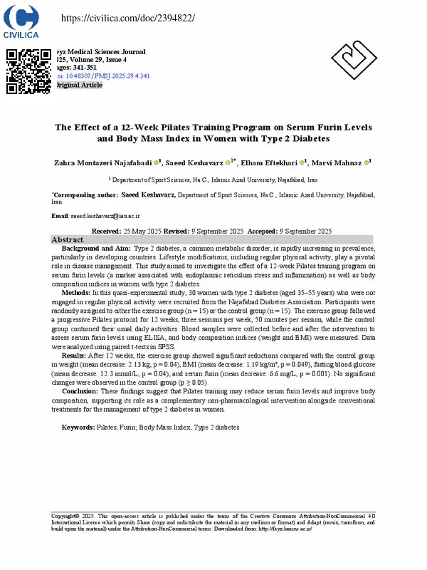 نتیجه گیری: با توجه به نتایج، به نظر می رسد تمرینات پیلاتس می تواند با کاهش سطوح فورین و بهبود ترکیب بدنی، به عنوان یک مداخله غیردارویی مکمل در کنار درمان های رایج برای مدیریت دیابت نوع ۲ در زنان پیشنهاد شود.