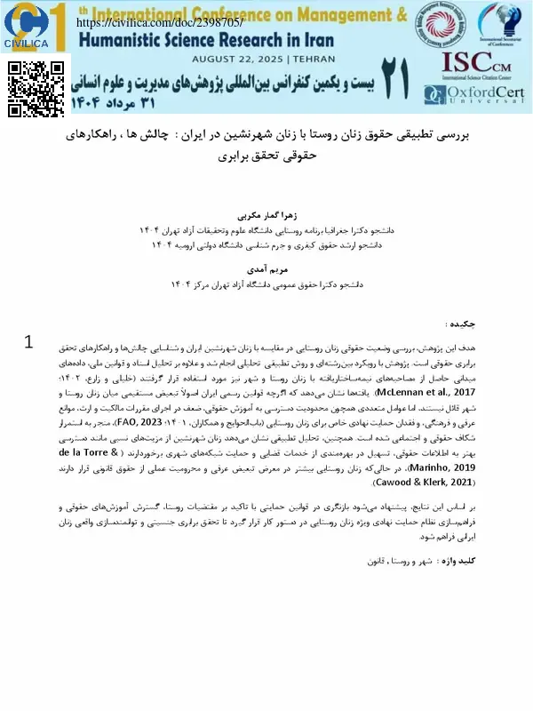 هدف این پژوهش، بررسی وضعیت حقوقی زنان روستایی در مقایسه با زنان شهرنشین ایران و شناسایی چالش ها و راهکارهای تحقق برابری حقوقی است. پژوهش با رویکرد بین رشته ای و روش تطبیقی-تحلیلی انجام شد و علاوه بر تحلیل اسناد و قوانین ملی، داده های میدانی حاصل از مصاحبه های نیمه ساختاریافته با زنان روستا و شهر نیز مورد استفاده قرار گرفتند. یافته ها نشان می دهد که اگرچه قوانین رسمی ایران اصولا تبعیض مستقیمی میان زنان روستا و شهر قائل نیستند، اما عوامل متعددی همچون محدودیت دسترسی به آموزش حقوقی، ضعف در اجرای مقررات مالکیت و ارث، موانع عرفی و فرهنگی، و فقدان حمایت نهادی خاص برای زنان روستایی، منجر به استمرار شکاف حقوقی و اجتماعی شده است. همچنین، تحلیل تطبیقی نشان می دهد زنان شهرنشین از مزیت های نسبی مانند دسترسی بهتر به اطلاعات حقوقی، تسهیل در بهره مندی از خدمات قضایی و حمایت شبکه های شهری برخوردارند، در حالی که زنان روستایی بیشتر در معرض تبعیض عرفی و محرومیت عملی از حقوق قانونی قرار دارند.